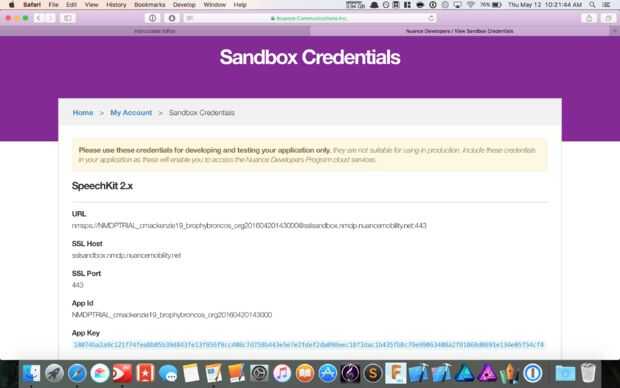 Si usted está buscando para construir la aplicación desde cero, o si simplemente quieres utilizar nuestra aplicación, tiene su propio perfil de matiz. No seleccione "Quiere matiz mezcla Beta?". Una vez haya confirmado su cuenta, iniciar sesión y ver sus credenciales de sandbox. Copiar y pegar la URL, Host SSL, SSL puerto, agregar ID y clave de la aplicación bajo "SpeechKit 2.x" en un documento accesible. Usted necesitará esta información más adelante.