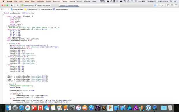 Ahora que tiene cocoapods instalado, puede abrir al cliente de Crazyflie. Se centran principalmente en el archivo ViewController.m y el método sendCommander: en particular. Si usted no se conoce bien con NSTimers, te recomiendo que lea la documentación de Apple o encontrar alguna otra fuente de información sobre ellos. No debería tener que editar los otros documentos y tener cuidado lo que cambias en la clase ViewController, como borrar siquiera una sola línea puede causar muchos errores pop-up y ser fatal para la aplicación. Recuerde golpear ⌘Z si algo va mal.