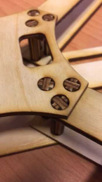 Un día que estaba tendido en la cama, pensando en cómo puedo hacer que un tornillo lo puedo temporalmente montar los aviones no tripulados para ver si los componentes. Tuve la idea de cortar dos piezas de madera y hacer un perno fuera de él. Midiendo el diámetro de los agujeros he decidido cuánto los tornillos tenían que ser. Ive nunca hecho algo como esto antes, y me funciono... Enorme sensación de éxito!