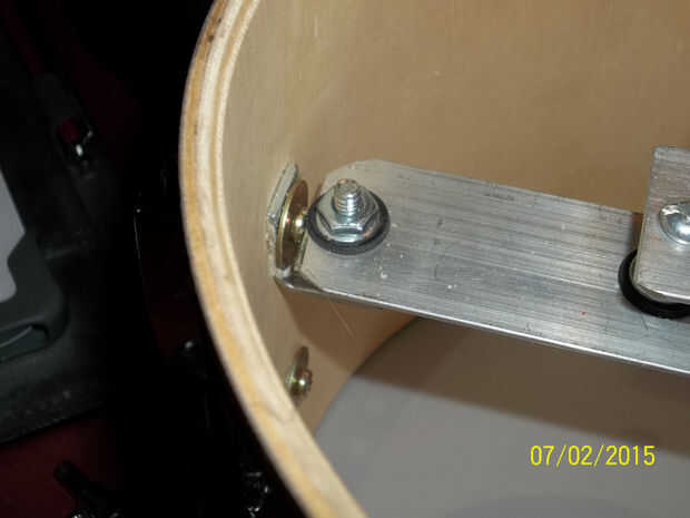 Entonces usted necesitará montar el piezoeléctrico dentro del tambor. Los soportes de ángulo simple ferretería trabajó como un encanto. Simplemente Atornille con algunos de lo hardware del tambor. Cortar unas tiras delgadas de aluminio, otra vez de la misma ferretería comprada como una franja de longitud de 4 pies, corte para caber dentro de tu tambor, perfore un orificio en cada extremo para pernos en los soportes de ángulo. Asegúrese de que usted utilice tuercas por todas partes así que costumbre se desintegraría.