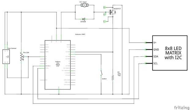 Usé el ángulo recto hembra encabezados para facilitar la conexión de componentes externos (led matriz, sensor de gas, motor de la C.C. y arduino) a la placa PCB.