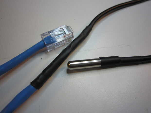 Lo único que queda para hacer ahora es añadir la tubería a la conexión entre la sonda y el cable del encogimiento y colocar un conector RJ45 en el extremo del cable CAT 5. Ahora es posible hacer sondas como usted quiere y tiene una forma estándar para conectar las puntas de prueba a un arduino para reportar las temperaturas.