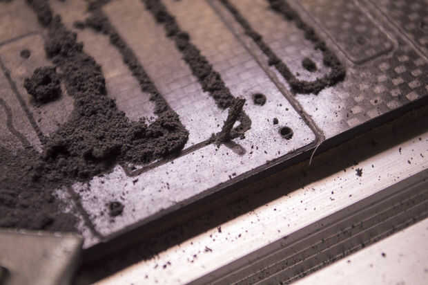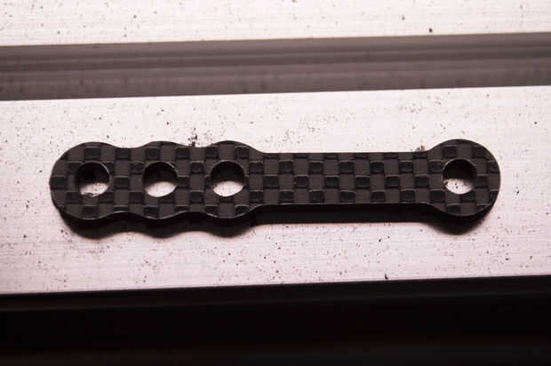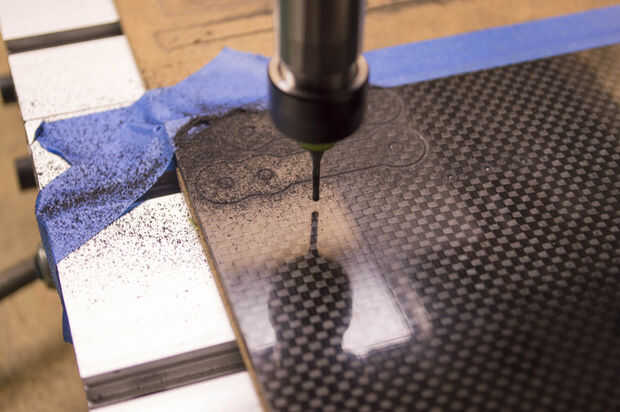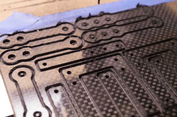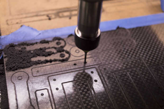 Después de terminar las placas CAD, yo entonces convertidos gCode con SheetCam. A partir de ahí puse en CNC y cortar las piezas de una placa de fibra de carbono de 2.5mm (Asegúrese de usar el filtro de la máscara adecuada al corte de fibra de carbono!). Tuve que hacer 3 pasos a través de la placa debido a un débil eje. Estos múltiples pasadas terminaron creando bordes deshilachados que enarenada apagado utilizando las asperezas del metal del CNC y una lija de grano alta.