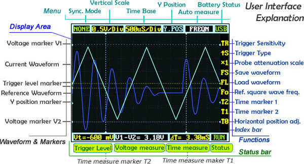 Y posición: Ajustar el marcador de posición Y para mover la curva hacia arriba y hacia abajo. Auto medida: Muestra mediciones simples de entrada de señal. (frecuencia, tiempo de ciclo, ciclo de trabajo, tensión de pico a pico, Voltaje RMS, voltaje promedio, voltaje de C.C.) Estado de la batería: Muestra el estado actual de la batería o USB si carga actualmente con puerto USB.