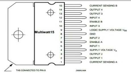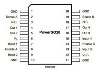 El L298 es un circuito monolítico integrado en una 15-plomo Multiwatt y PowerSO20. Es un alto voltaje, alta corriente controlador de puente completo dual diseñado para aceptar niveles de lógica TTL estándar y manejar cargas inductivas como relés, solenoides, DC y motores paso a paso. Entradas de habilitación dos se proporcionan para activar o desactivar el dispositivo independientemente de las señales de entrada. Los emisores de los transistores inferiores de cada puente están conectados juntos y el correspondiente terminal externo puede ser utilizado para la conexión de un resistor de detección externa. Una entrada de alimentación adicional se proporciona para que la lógica funciona a un voltaje menor.