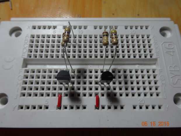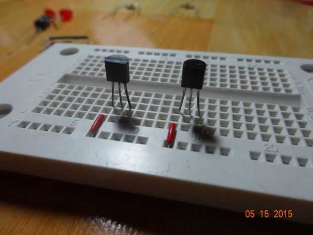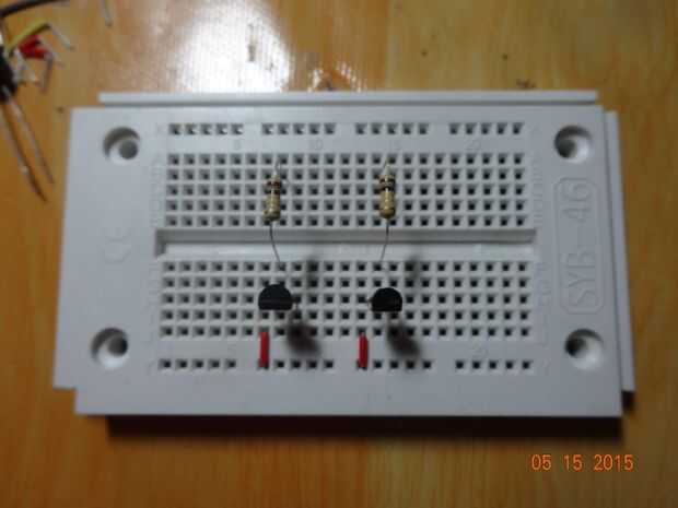 Inserte los 2 transistores en la placa como la de la foto. A continuación, conecte los emisores de los transistores del 2 hasta el ferrocarril de ground(negative).