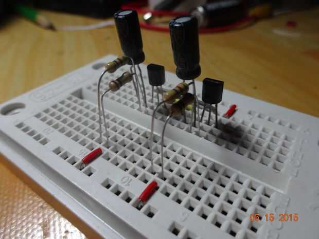 el primer proyecto jamás construido fue una luz que titilaba y apagar. Tomó nueve partes y un par de cables. Agradable y fácil.Con algunas resistencias y condensadores, he configurado básicamente un chip 555 temporizador como oscilador (término fanta