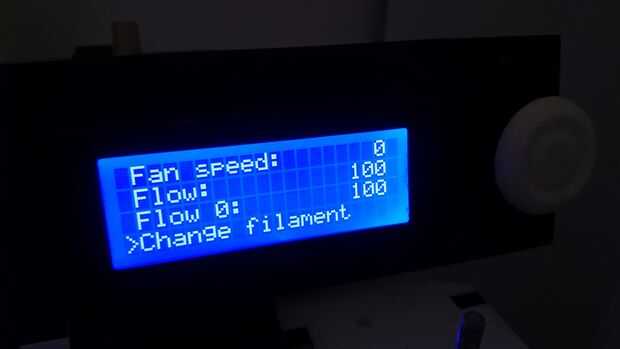 Seleccione "Ajuste". Y en el siguiente menú, desplácese hacia abajo hasta "Filamento de cambio". Pero tenga cuidado, presione el cambio filamento sólo cuando su impresora llega a la última capa antes del intercambio del filamento.