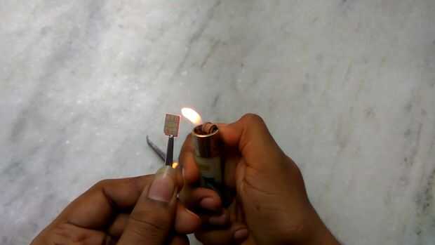 2. calentar el lado plástico de la tarjeta Nano SIM durante unos 3 segundos con un mechero. Retire el chip a la tarjeta SIM de nano con twiser.