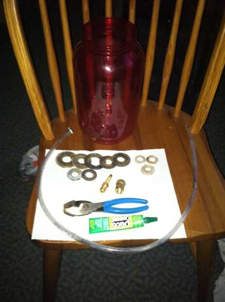 Varias arandelas grandes (que se encuentra en mi caja de herramientas) A té jarra con boquilla extraíble en la manguera de aire inferior ($1,50) (que se encuentra en mi caja de herramientas) de pescado tanque de agua la manguera (también en mi caja de herramientas) y ducto de cemento ($1,00 en el almacén del dólar)