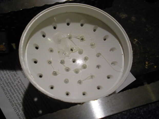 3. una vez que se calienta la pistola encoladora, empezar a exprimir pequeñas gotas muy cautelosamente en cada uno de los agujeros en los dos aros interiores, dejando el agujero de centro despejado. De esta manera sólo conseguiremos agua por el agujero central y el anillo exterior. Si se obstruye el orificio central, utilice el palillo de fósforo para despejar hacia fuera.