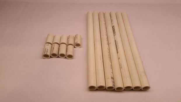 Utilizando mi espacio que me decidí por 7 piezas de PVC largo de 12 1/2 pulgada y 9 piezas de PVC largo 1 1/2 pulgada. Esto me permitiría permanecer dentro de mis limitaciones de mi ducha es de 29 pulgadas de ancho.