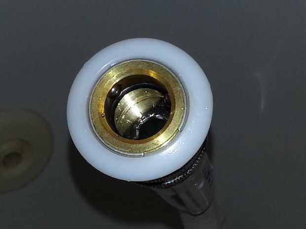 2) envolver algunos cinta del sello del hilo de rosca alrededor de las roscas del adaptador macho snap y atorníllelo firmemente en la boquilla.