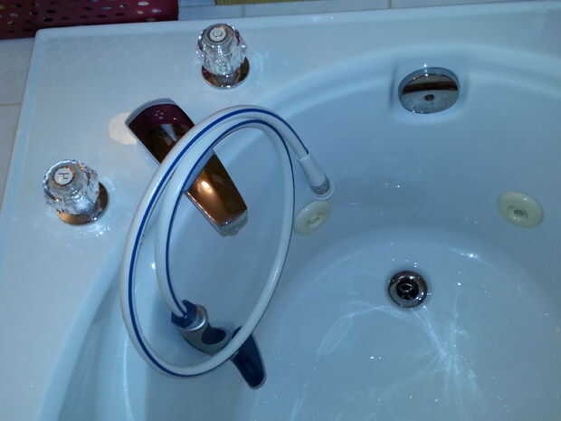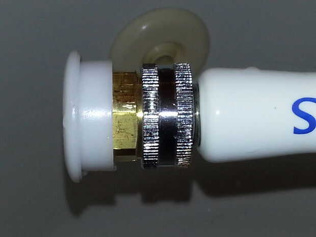 7) Tire hacia atrás el anillo blanco en el adaptador del complemento femenino para agregar o quitar la regadera de mano del surtidor de la bañera.