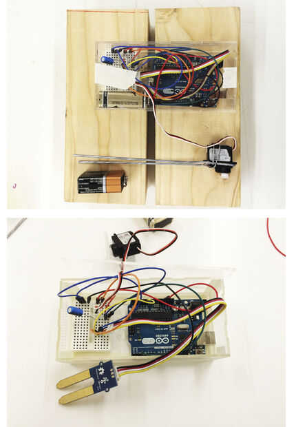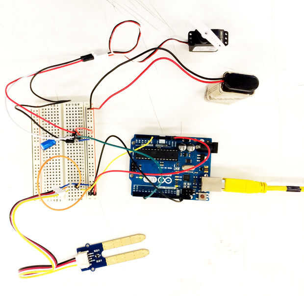 Este sistema funciona mediante un sensor capta la humadad hay en la tierra. Cuando este detecta hay poca humedad (< 400), el Servo en de Motor gira 45 º, logrando el elefante bote agua por su trompa.