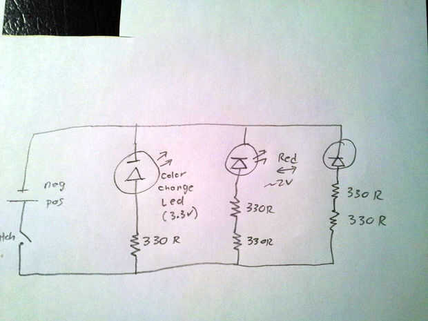 El diseño del circuito es en la primera foto. Básicamente utiliza resistencias a la tensión para el LED. Hay muchos recursos de internet para ayudar a calcular la resistencia necesaria para varios LED y baterías. Esto es una buena calcular valores de resistencia para varios LED y baterías