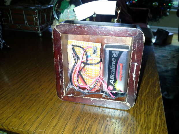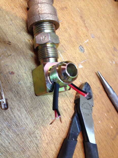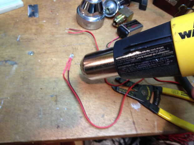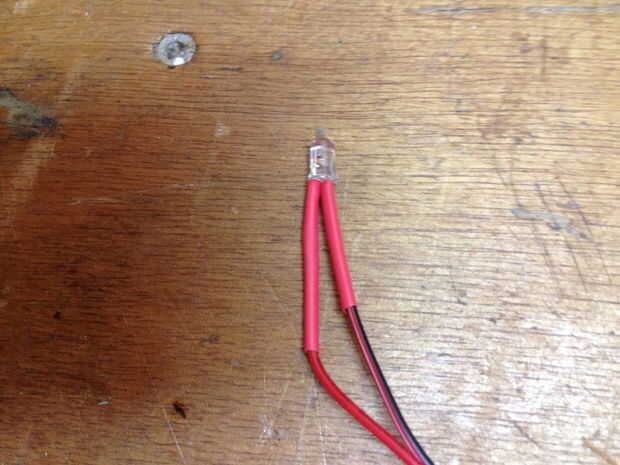 Los LED tienen tubo retráctil para aislar los conductores. Elaborar el cable a través de una bodega en la parte superior de la caja y luego a través de los accesorios para los ojos. La nariz intermitente tiene una cucharada de pegamento caliente para actuar como difusor.