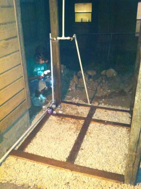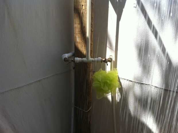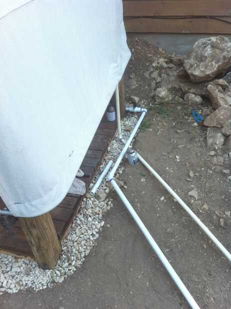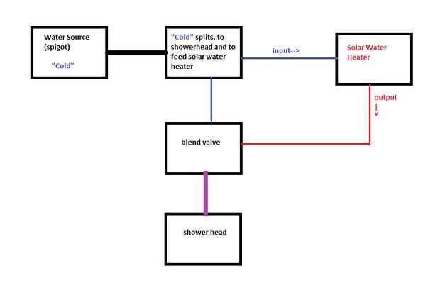 TL; dr: consigue el agua de la llave a su ducha y usar un empalme "T" la fuente de su calentador de agua solar y válvula de mezcla. Se necesita una cantidad adecuada de 1/2" o 3/4" pvc, dos válvulas, uniones de 90 grados, 45 grados articulaciones, pegamento para pvc y cartilla de pvc.