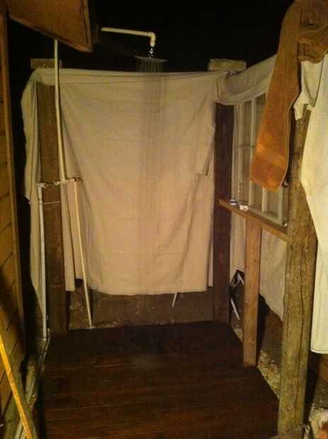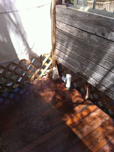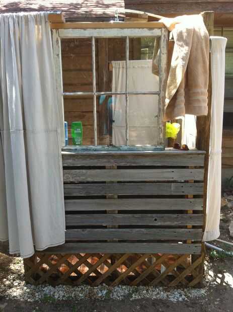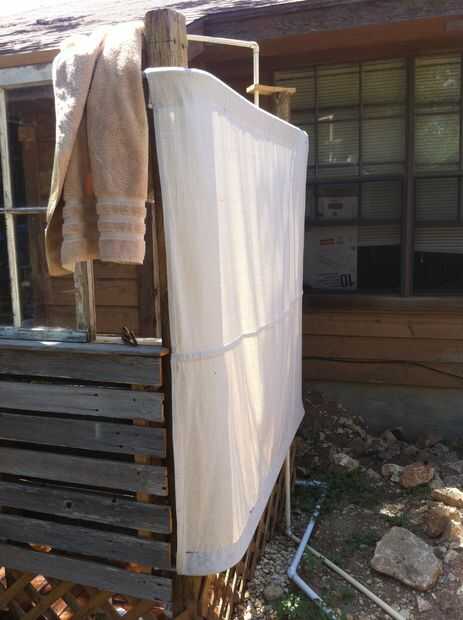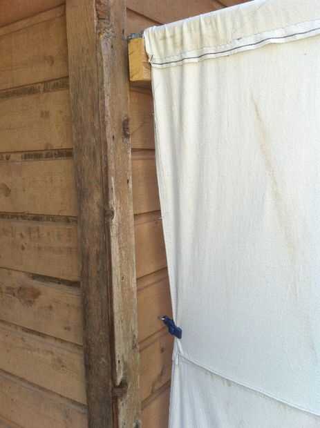 Terminada la lona trasera pared y cortina delantera había dejado deliberadamente un poco de espacio en la parte inferior y la parte superior y luego cortar las piezas de enrejado para caber en los espacios. Quería que esta ducha para "respirar" y que quería evitar el cierre de ese espacio a todos. El enrejado era una buena opción porque deja aire la parte inferior y el agua puede encontrar fácilmente su camino a través de él.