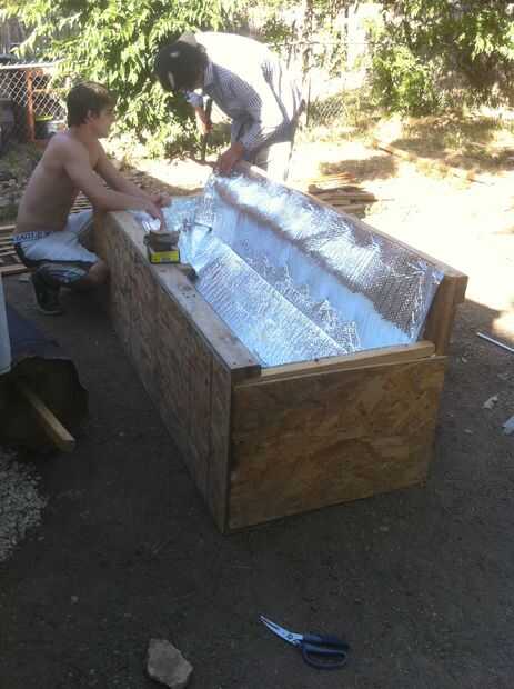 Así que, una vez construido el "marco", tienes que cerrar en todos los lados y parte inferior de la caja caliente con madera contrachapada. Todo lo que pude encontrar fue el material OSB barato, pero yo habría utilizado madera contrachapada de la buena si tuviera los fondos. Una vez los lados y la parte inferior, cierre todos los lugares donde se unen 2 o más piezas de madera con algún tipo de sellador. Utilizamos Grandes cosas. Ser generosos con sus cosas. Una vez tus cosas, salir de su aislamiento y camisa de manga larga. Se utilizó aislamiento de fibra de vidrio con el valor de "R" más alto que pude encontrar. También puede utilizar capas de agua calentador mantas o chaquetas de calentador de agua. Todo el interior de la caja de la capa con tantas capas como sea posible. Puede utilizar algo como alambre de pollo rígido para mantener su aislamiento en su lugar mientras que usted fije el material reflectante en la parte superior del aislamiento. Digo esto porque hemos luchado con el material reflectante debido a la falta de restricción del aislamiento. El material reflectante que utilizamos fue reflectix.