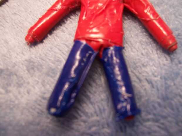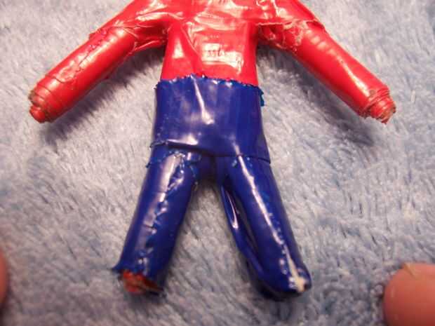 bien tu chico está desnudo. podría ayudar a poner unos pantalones de él. así que lo que puede hacer dependiendo de la persona que usted está haciendo necesario para hacer ropa para tu persona. la más básica sería darle pantalones. para empezar a tomar una tira de otro color de ducktape el legth mismo de las piernas y fractura en medio estilo perrito caliente luego envolver cada tira verticalmente alrededor cada uno de la pierna. También asegúrese de tomar un pequeño pedazo y ponlo en la entrepierna. Ahora toma una tira de 1/4 y envuélvalo alrededor de la cintura. una vez hecho esto estará terminado. excepto por cara y esas cosas.