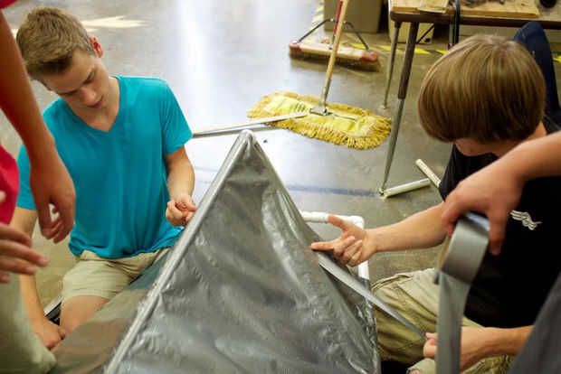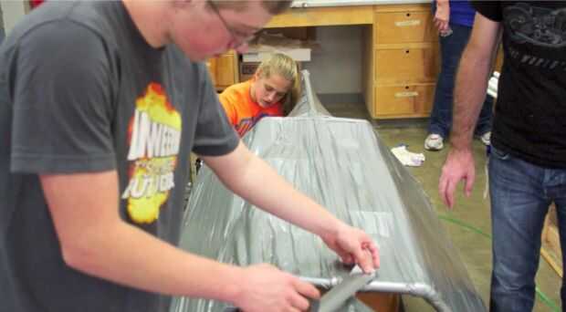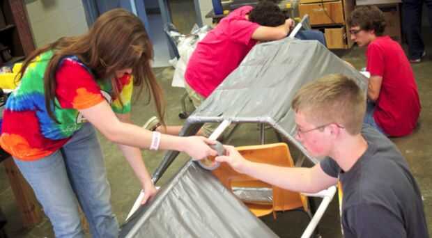 Un barco de cartulina/ductape construido para una competición. Los planes fueron construidos usando el Autocad y luego un montón de cinta pato y cartón