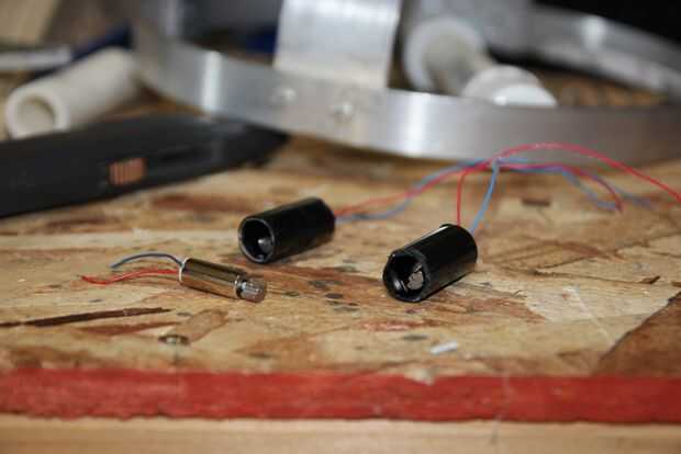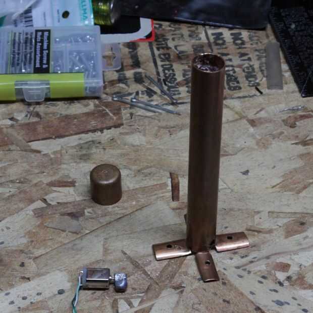 Hice dos asas para que el usuario sostener, hice estos de tubos de cobre. Quería que el cobre que patina un poco en él, por lo que para darle un tinte verdoso coloca los tubos en una bolsita de plástico con un par de huevos duros que rompieron para arriba. Al parecer el azufre en los huevos reacciona con el cobre para acelerar el proceso de oxidación. Química Go! Compré algunos motores pager, pero no tienen suficiente vibración para mi gusto en las manijas. Así que compré algunos motores de la C.C. 9V 10.000 RPM y prensado pesos de pesca de plomo en los extremos. I utiliza pegamento caliente para montar los motores en las tuberías y luego atornillar los tubos en los reposabrazos.