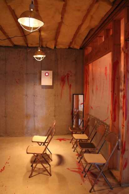 La silla simulada fue controlada por un micro controlador Arduino. Se creó así que cuando se pulsa un botón en la pared, se iniciaría un ciclo. Una vez que el ciclo comenzó con la plantilla vio así el maniquí sacudiría y hacia atrás. Arduino también estaba conectada a las luces de la habitación. He utilizado luces de incubadoras que tenían una cubierta protectora de la rejilla de alambre agradable en ellas. Dentro de las luces le puse bombillas de luz de estilo de Edison. Cuando se presiona el botón las luces parpadean en y off para simular la corriente llevaría a electrocutar a mi víctima. El último efecto desencadenado por la presión del botón fue que le brillan los ojos del maniquí. Cada ojo parpadeo y apagado independientemente en un extraño color azul. Después de que terminara el ciclo dejaría de la Sierra la luz volvería y los ojos se descoloraría lentamente hasta que se apaga como si la electricidad fue dejando el cadáver.