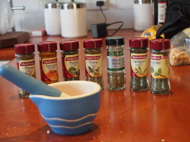 Luego simplemente cogí alguna especia de tierra pensaba iría fuera del armario: cilantro, estragón, tomillo, mezclada de hierbas, perejil, polvo de chiles, marroquí, condimento, cardamomo, canela, cinco especias etc..