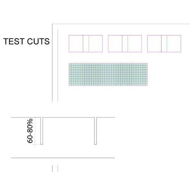 ¿Observe los tres rectángulos en la parte superior las rejillas? Son cortes de prueba, y esto es realmente importante. Usted quiere cortar 60-80% en la hoja.