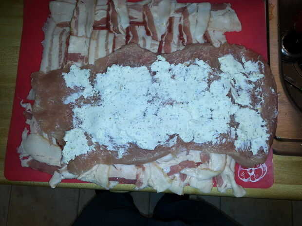 Echar el solomillo encima de la armadura de tocino y luego el queso boursin sobre el lomo. Elegí un queso de hierba de ajo pero puede elegir cualquier sabor que te gusta.
