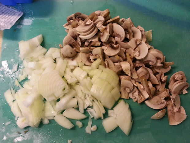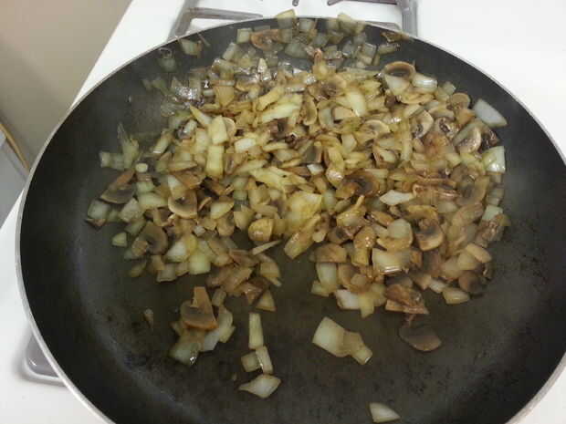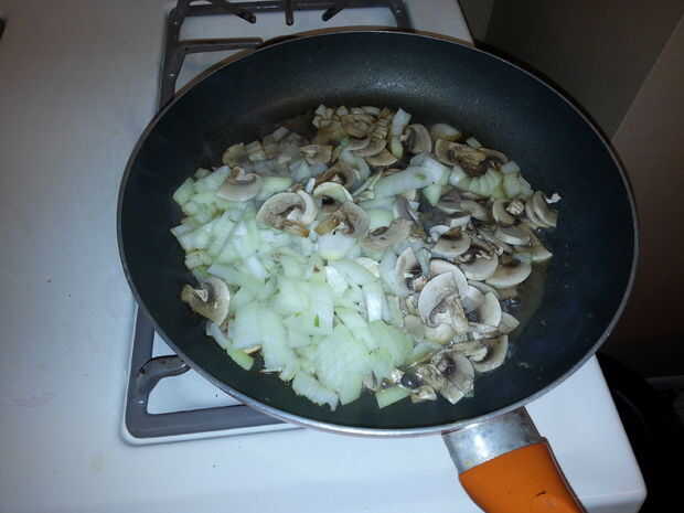 Cortar los chupones y se fríen. Yo uso aceite de coco pero es sólo una elección personal. Generalmente sugiero usar mantequilla. Cocer todo hasta que los champiñones y las cebollas son bonitas y tiernas.