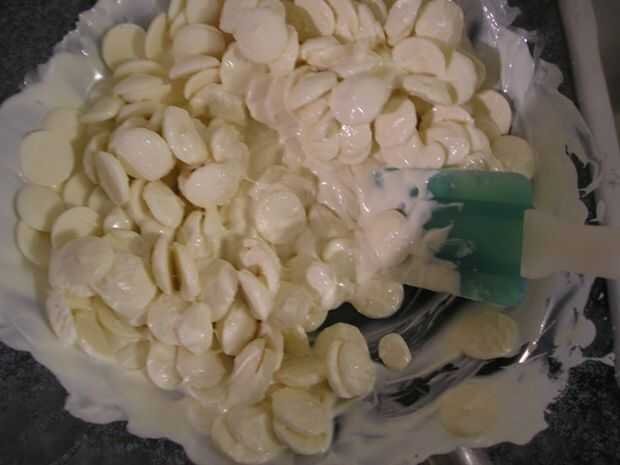 Si utiliza chips de chocolate blanco que es necesario agregar una cucharada de mantequilla derretida una vez para ablandar el chocolate cuando endurece, esto también hará más suave y más fácil de trabajar con...