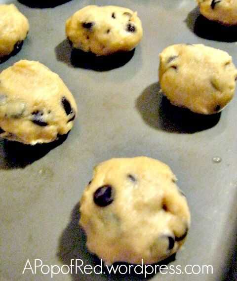 Colocar cantidades de cucharada tamaño de masa redondeada (no pelotas, bordes levemente redondeados) en una bandeja para galletas sin enmantecar y hornear a 375F para 8-10 minutos.