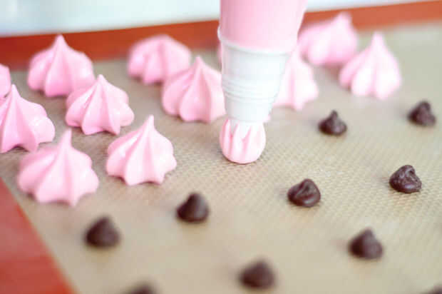 Forma una manga pastelera con una punta de la estrella de Wilton (o similar), rellenar con el merengue, tubo pequeño (3/4 pulgadas de altura) estrellas formas y en hojas para hornear preparadas, centrado cada estrella encima de un chip de chocolate. Bolsa de relleno según sea necesario.