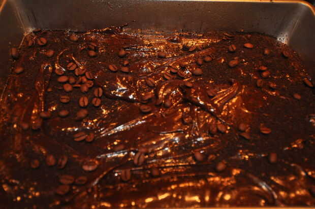Bien una vez que el fudge es ir agradable y mezclado todos adelante y pobres en la bandeja de la torta engrasado arriba. Cuando se alisó hacia fuera, puede ya sea dejarlo lo es y pegarlo en la nevera para reafirmar o puede Agregar un poco más de brío que lo que hice es rociada algún café en la parte superior y luego empujó algunos granos de café espresso en ella para darle ese factor de contracción. Una vez que han manipulado el palo dulce el pan en la nevera y tampoco dejarla sentarse durante la noche o para una buena parte del tiempo.