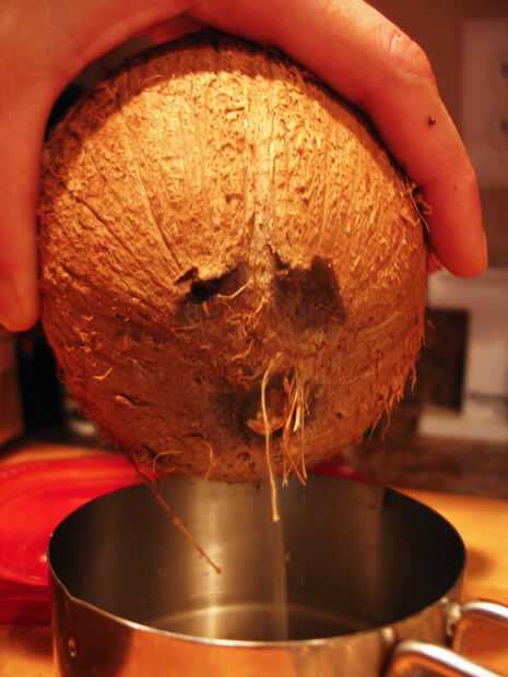 - Poner un agujero en cada uno de los "ojos de mono" en su coco, drenar todo el líquido y reservar.