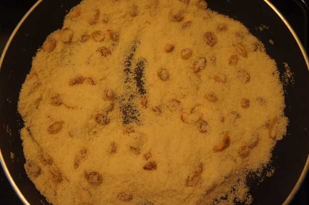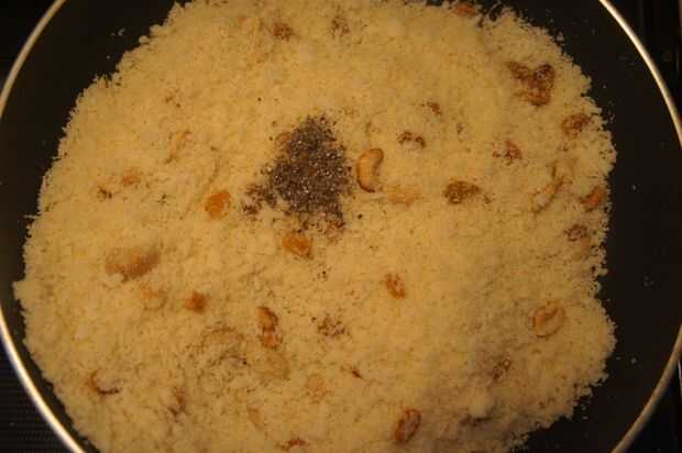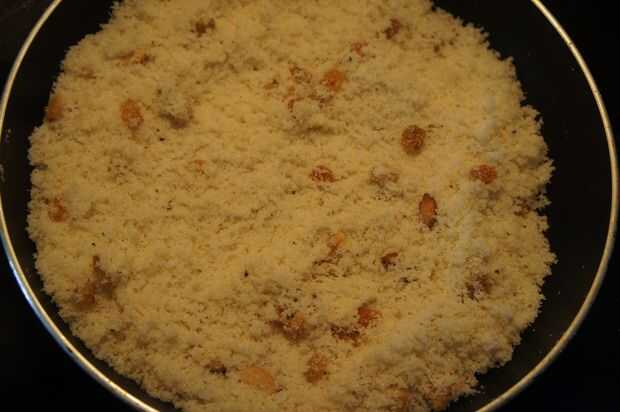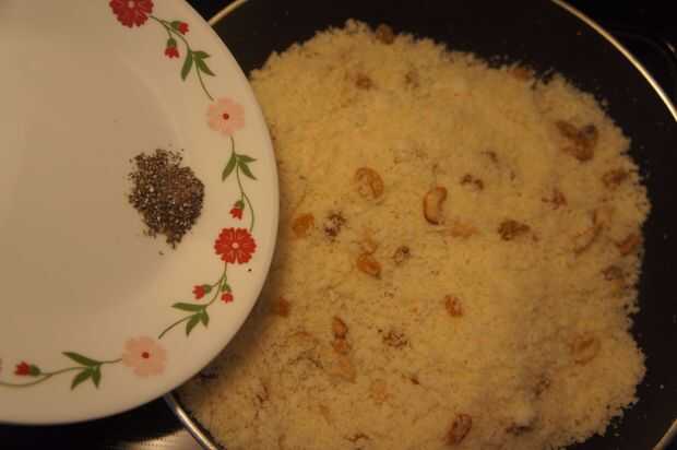 2) luego añadir sémola/sooji y freír por unos minutos y luego añadir el coco rallado junto con el cardamomo de tierra.