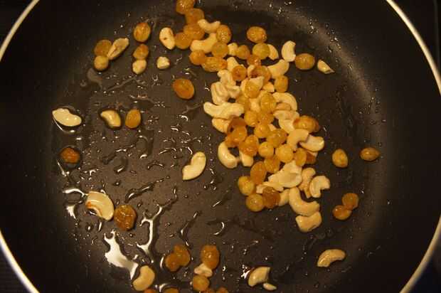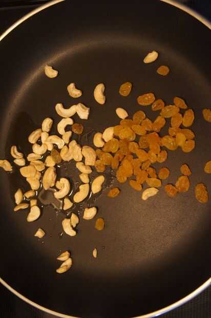 1) Coloque una cacerola a fuego medio, agregar mantequilla, anacardo, pasas de uva y freír hasta que doren.