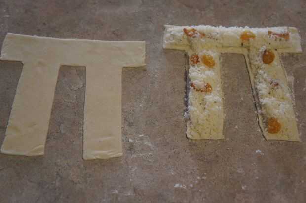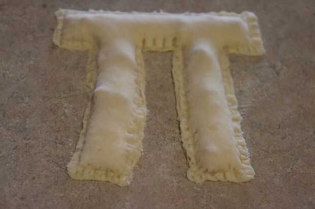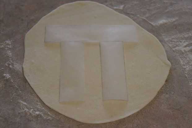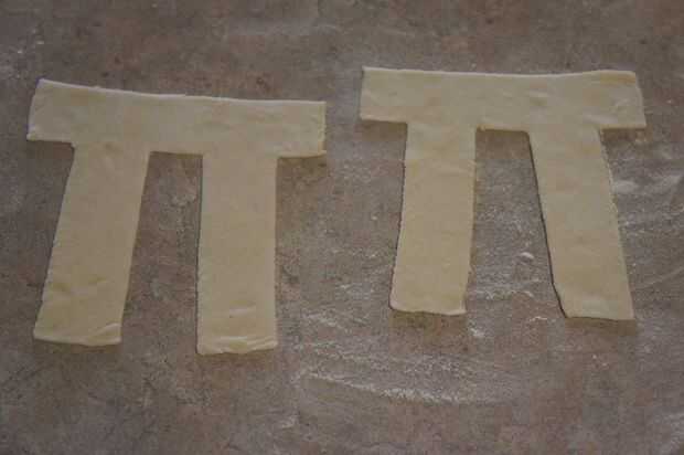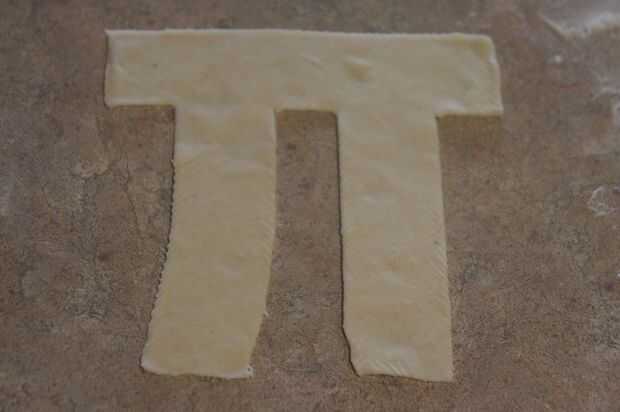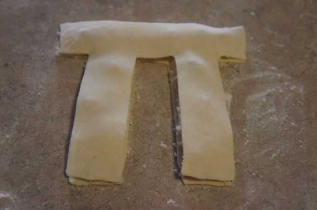 3) Coloque la plantilla de Pi en la parte superior de la masa enrollada y cortar la masa en forma de pi.