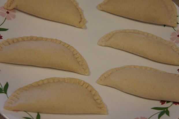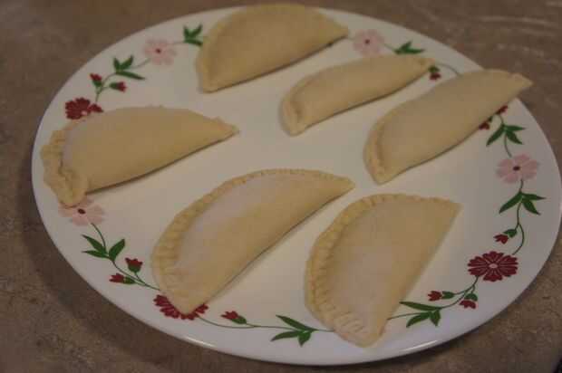 2) luego aplicar agua alrededor del círculo y dóblalo para hacer un semicírculo. Sello apretado y hacer diseño con tenedor.