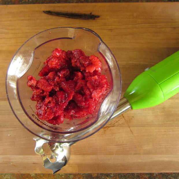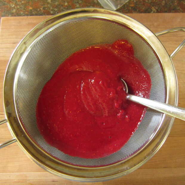 3. usando una batidora o licuadora mezclar frambuesas. Establecer un colador de malla fina sobre un tazón y vierta las bayas mezcladas en colador. Con un revuelo de cuchara hasta que quedan solamente las semillas. Set puré a un lado.