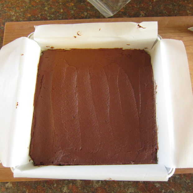 Mezcla una cuchara en un plato para hornear de 9 x 9 pulgadas forrado con papel sulfurizado y liso de una capa uniforme.