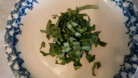 Tirar el pollo en trozos pequeños, rebanada higos mitad una pulgada y picar la albahaca fresca.