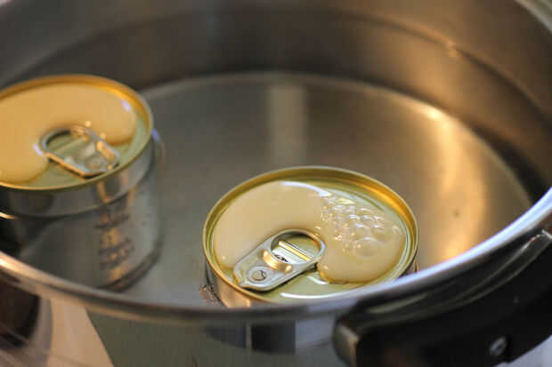 Después de 4 horas se apaga el fuego, dejar enfriar y luego quitar las latas de la cacerola. Despegar la parte superior de la lata y sacar el caramelo / dulce de leche.