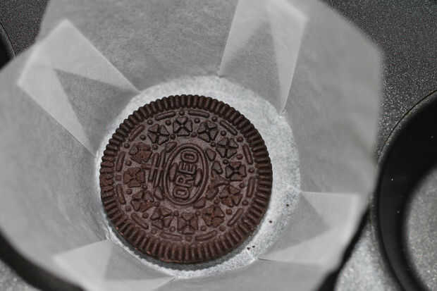 Línea de muffin hornear latas con los papeles de Magdalena/muffin, necesita 14 para esta receta. Coloque un oreo solo en la parte inferior de cada papel.