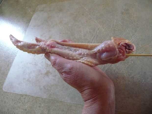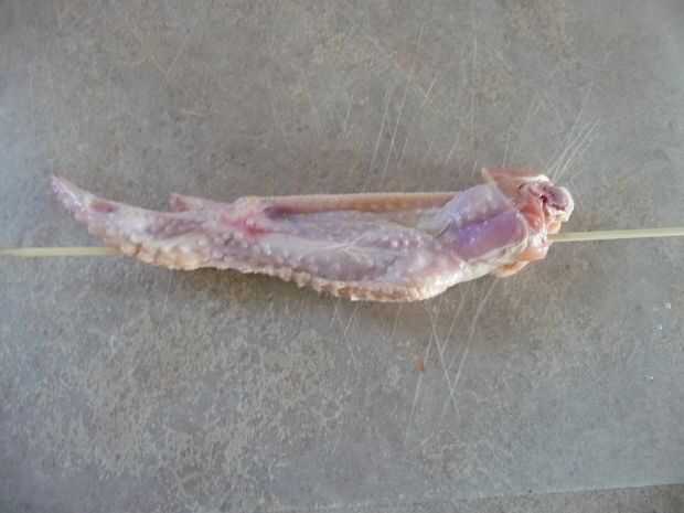 Sujetar el ala con la parte inferior hacia arriba. Insertar al principio de pincho al final drummette, (ver foto) y giro/empuje lo hacia la punta del ala, manteniendo siempre el pincho en la parte inferior del ala. Trabajar lentamente y no fuerce la broqueta. Usted será capaz de ver y sentir el progreso mientras que viaja hacia la punta. Si la brocheta se atasca contra un hueso común, sólo aliviar lo hacia atrás un poco, luego giro y empuje a través de en un lugar diferente.