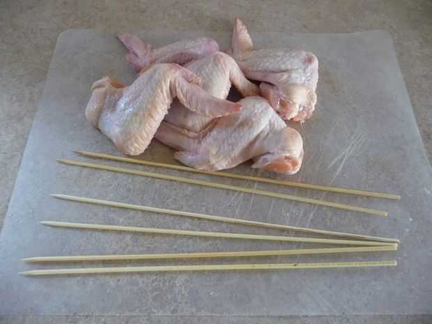 Descubrí skewering el ala entero con un palito de bambú sin pinchar la piel es muy fácil! Voy a hacer esto mucho más a menudo con otras recetas de ala.