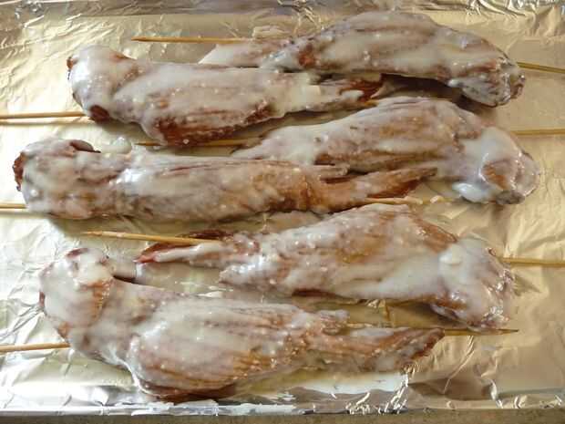 Cepille las alitas de pollo generosamente con la marinada de Kecap Manis. Cubra con envoltura plástica y ponerlos en el frig por una hora. Usted puede incluso dejarlas en el frig durante la noche en esta etapa. Solo Voltee los pinchos cada pocos horas más o menos.