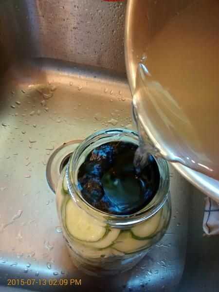 Aproximadamente 5 tazas de verduras debe llenar un tarro de medio galón. Alternas, añadiendo cukes, zukes, cebollas, zanahorias, y así sucesivamente en capas hasta que estés cerca de la cima.